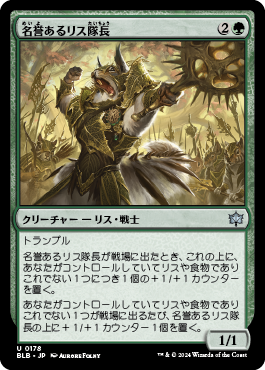 2マナ3/2に『食物』というだけで優秀ですが、リスなので《名誉あるリス隊長》に追加で+1/+1カウンターを置けます。