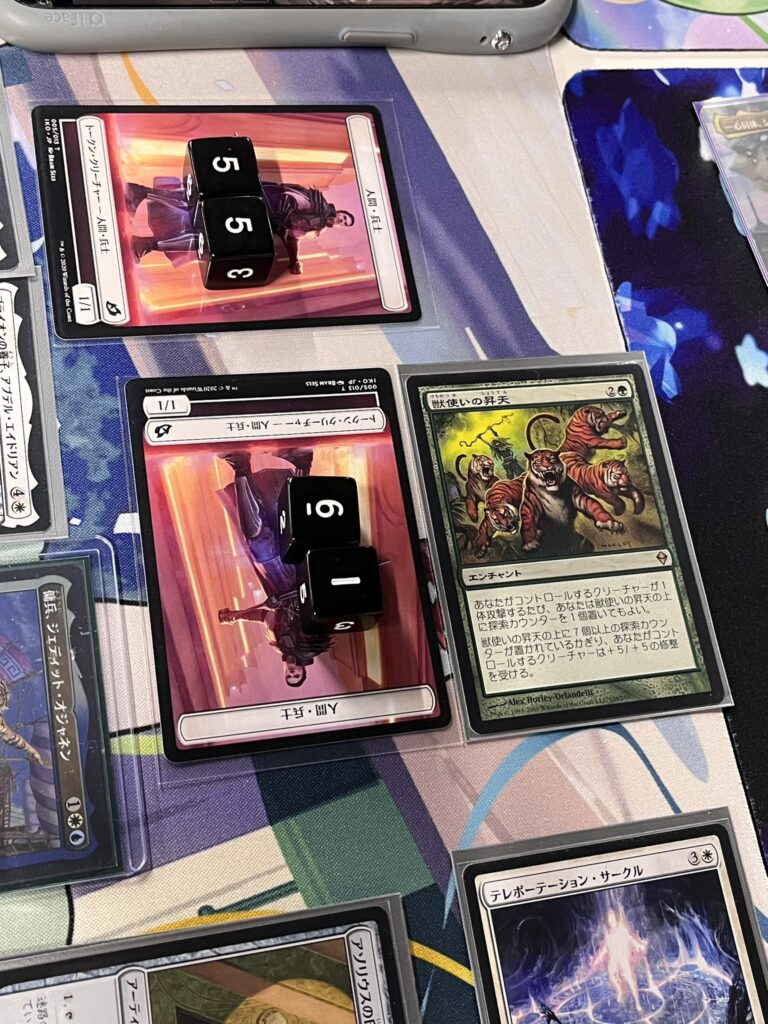 1/1を大量に並べたところで《獣使いの昇天》を投下!全体+5/+5修整を与えて、一気にライフを詰めきります。