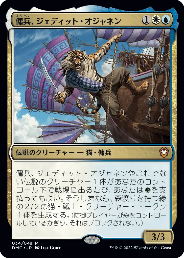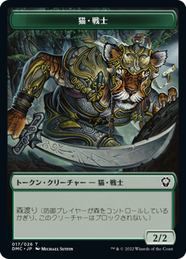 伝説のクリーチャーが出たときに緑1マナ払うことで、2/2森渡りの猫・トークンを生成するジェネラルです。