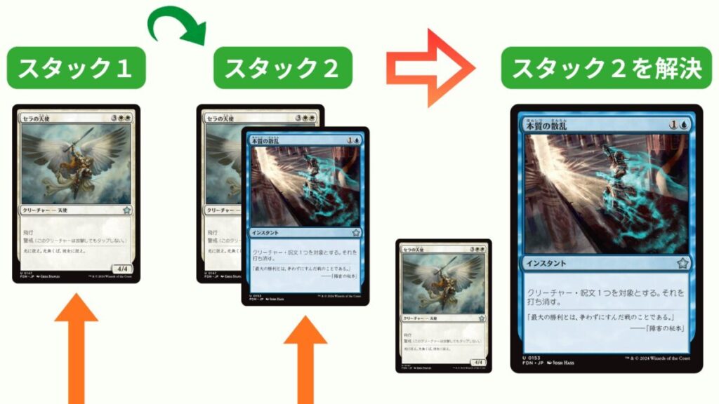 呪文や能力はスタック上に重ねられていき、すべてのプレイヤーが優先権をパスすると一番上のものが解決されます。(逆順処理)