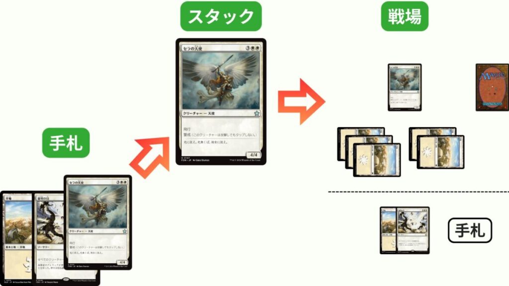 呪文や能力は一度、「スタック」と呼ばれる仮想の領域に置かれて解決を待ちます。