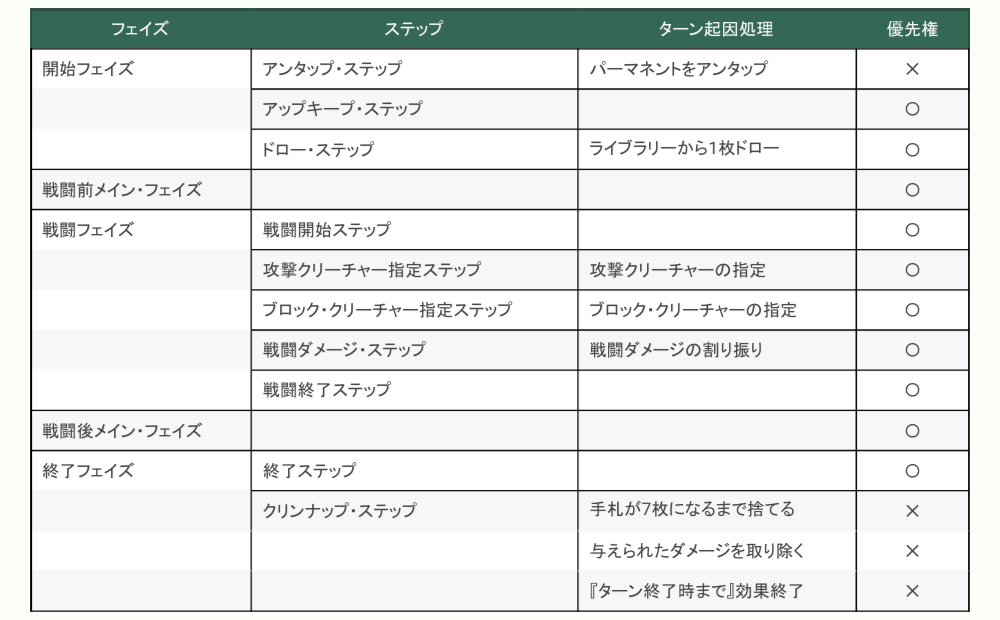 優先権は(アンタップ・ステップ、クリンナップ・ステップを除いた)各フェイズやステップでのターン起因処理の後に発生します。